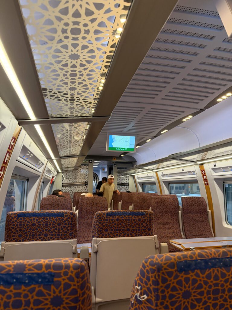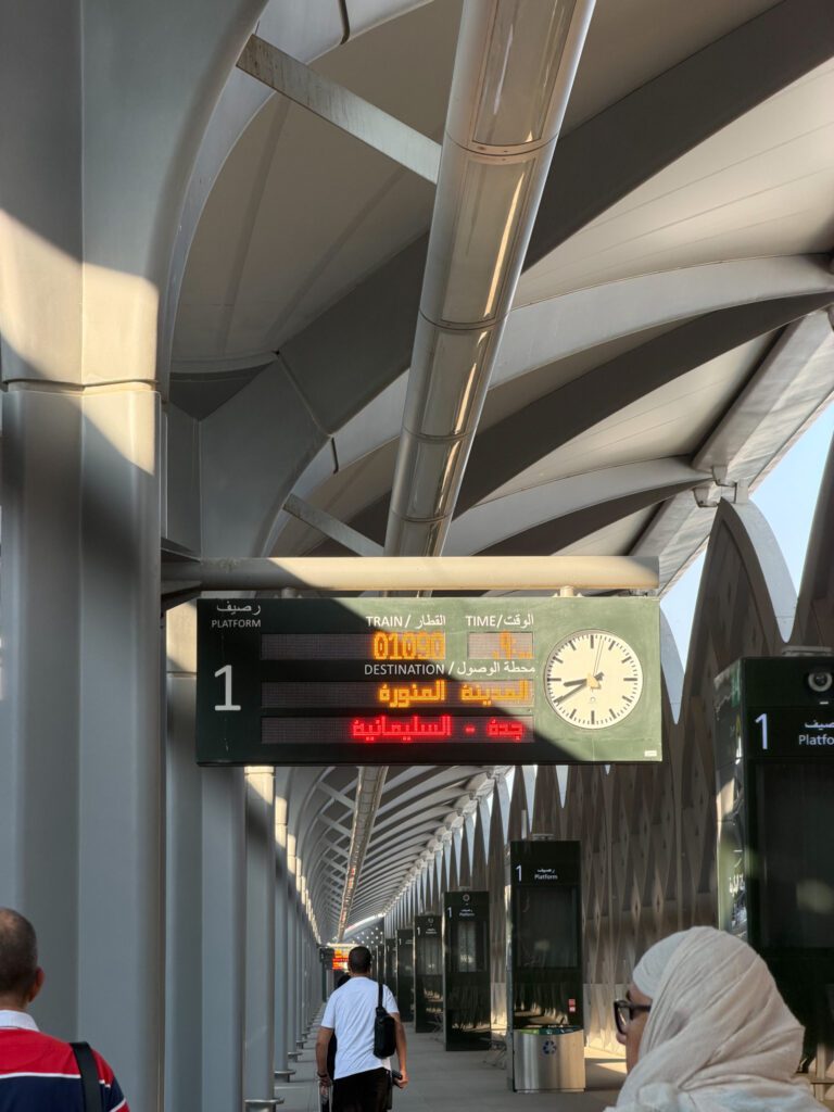 Après 4 journées intenses et profondément émouvantes à La Mecque, il est temps de poursuivre notre voyage spirituel vers Médine, la ville du Prophète ﷺ. Nous prenons le train Haramain à 9h depuis la gare de La Mecque et, 2h30 plus tard, nous y sommes déjà (j’ai d’ailleurs rédigé cet article où je donne plus de détails sur ce train).