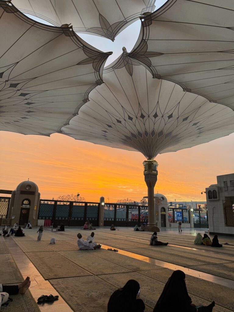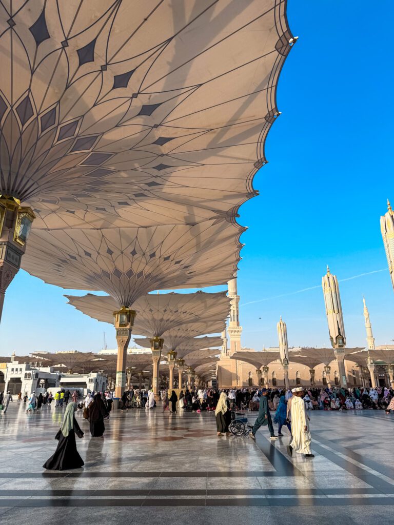 Quand j’entre pour la première fois dans l’enceinte d’Al-Masjid an-Nabawi, mon cœur se serre. Je lève les yeux, je vois les immenses parasols, la lumière, la foule paisible… et je réalise où je me trouve. Ici repose le Prophète ﷺ.