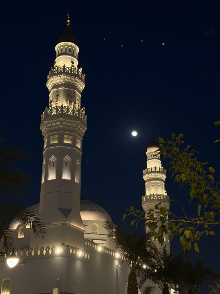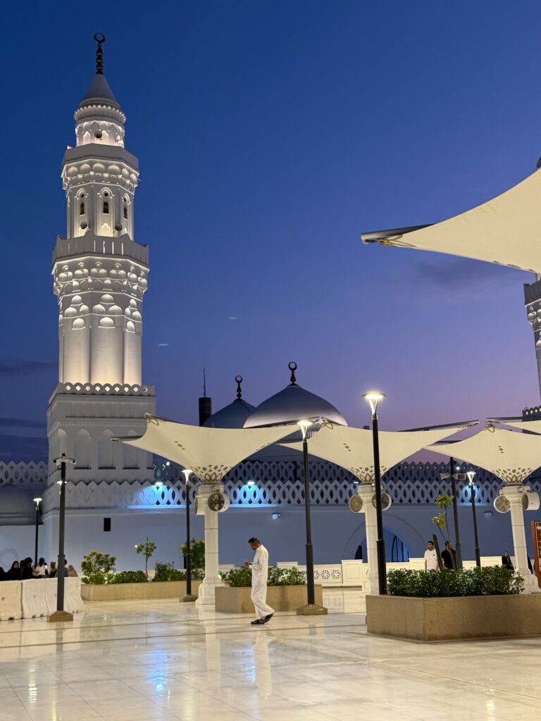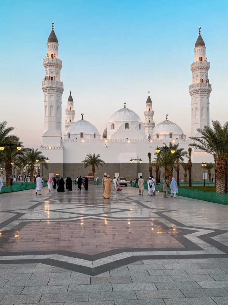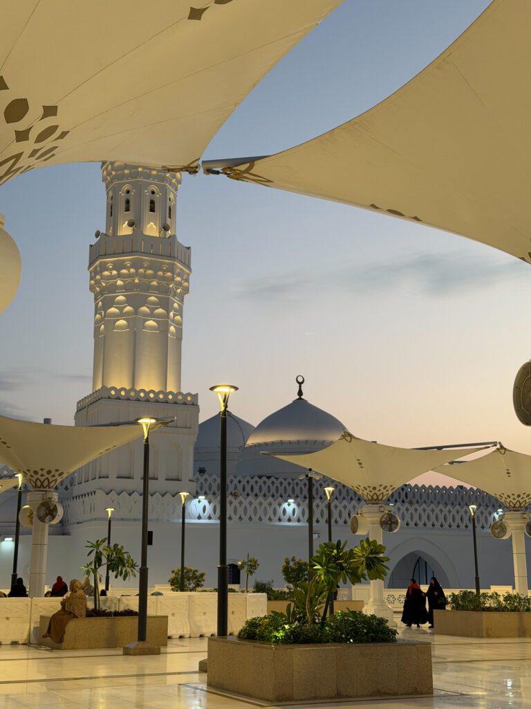 • Masjid Quba : c’est la première mosquée construite dans l’histoire de l’islam, fondée par le Prophète ﷺ lui‑même après la Hijra vers Médine. L’endroit porte une signification spirituelle immense pour les pèlerins. Selon un hadith authentique, « Celui qui accomplit ses ablutions chez lui, puis se rend à la mosquée de Quba et y prie, recevra une récompense équivalente à celle d’une Omra » — rien que cela.