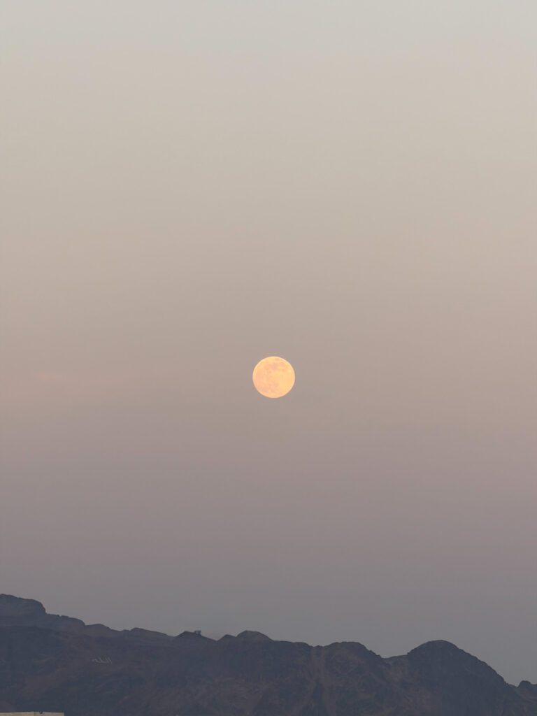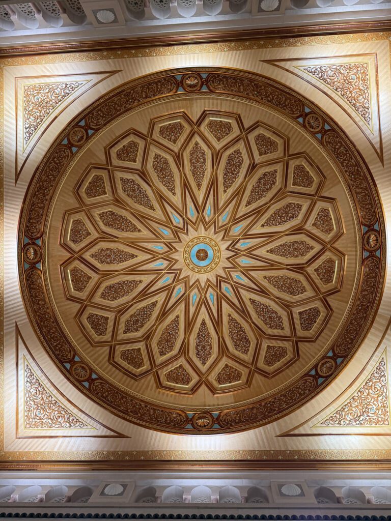Dès l’extérieur, j’ai été frappée par la beauté de cette mosquée blanche, à la fois lumineuse et élégante. Le jour de notre visite, le soleil se couchait progressivement, teintant le ciel de couleurs chaudes, tandis que la pleine lune faisait son apparition offrant un contraste magnifique.