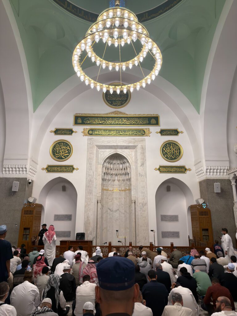 À l’arrivée, nous prenons un Uber et nous nous dirigeons directement vers notre hôtel, nous déposons nos bagages, et il est déjà l’heure de la prière du Dhuhr. Sans trop tarder, nous nous apprêtons à découvrir la mosquée du Prophète pour la toute première fois… Plus on s’en approche, plus l’émotion monte. L’atmosphère est différente de La Mecque : plus calme, plus douce, presque apaisante.