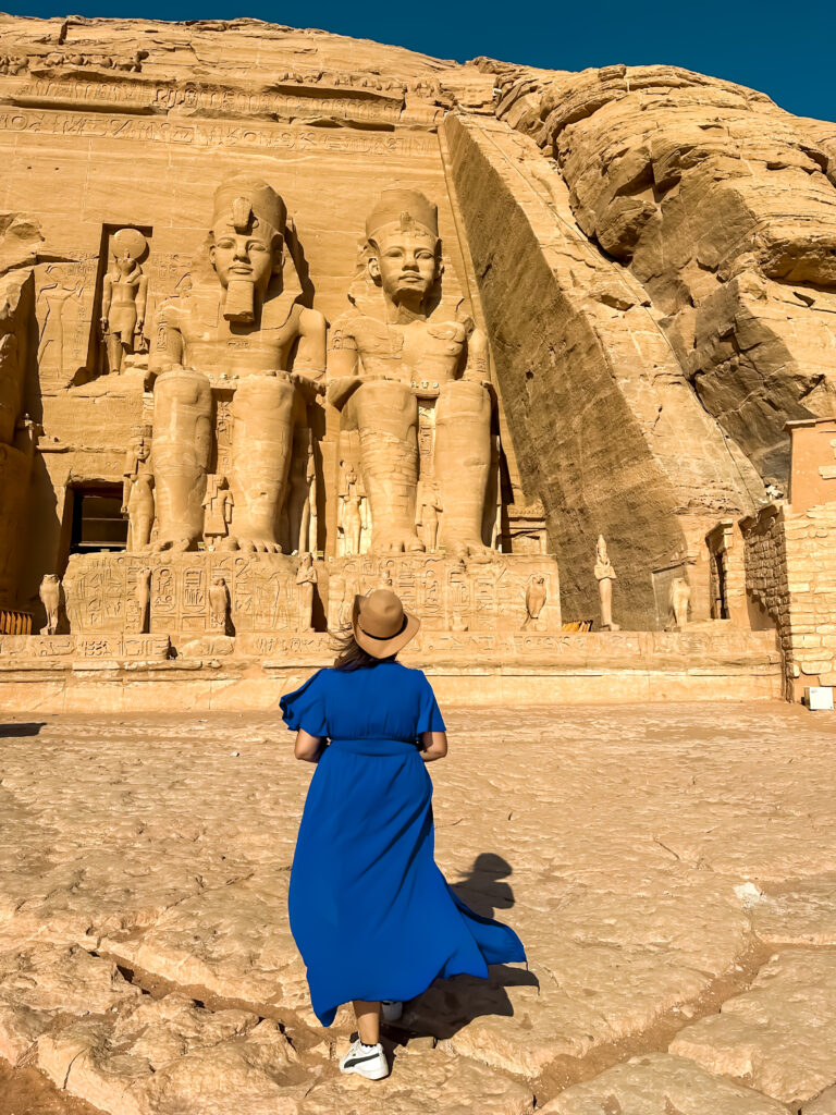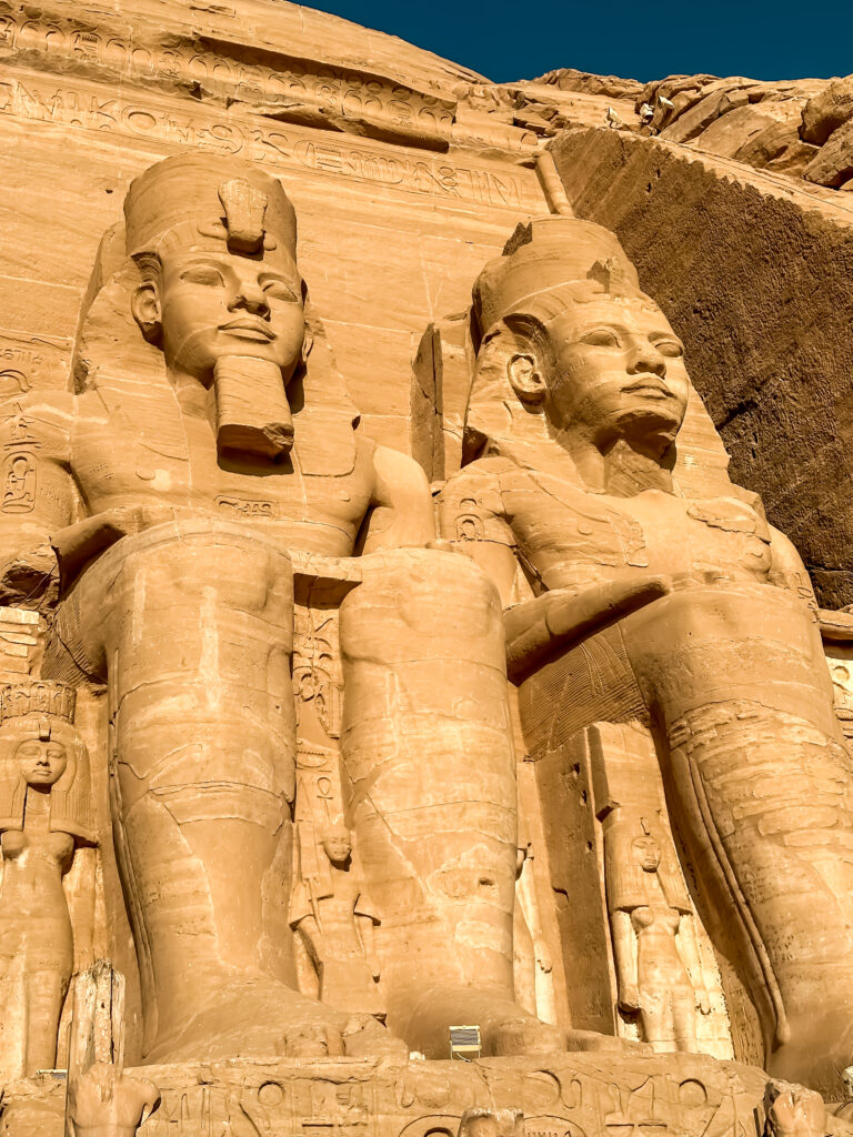 Le temple le plus impressionnant est celui de Ramsès II, reconnaissable à ses quatre statues colossales qui dominent le désert, tandis que le second, plus petit, est dédié à Néfertari.