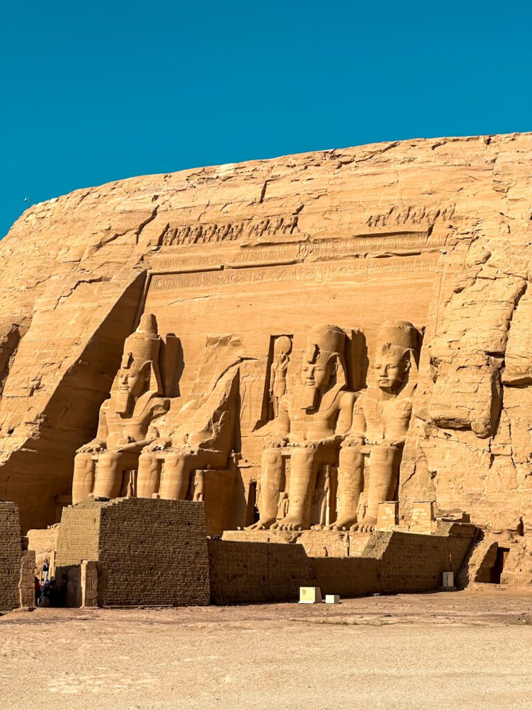 Il est 8h30 lorsque nous arrivons enfin sur le site d’Abu Simbel. Deux temples apparaissent soudainement, massifs et impressionnants, taillés à même la roche, dominant le paysage désertique. L’émotion est immédiate : le lieu est grandiose, monumental, presque irréel, et je réalise vite que l’attente et le réveil matinal en valaient largement la peine.