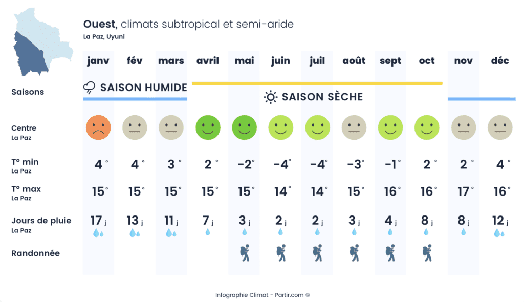 💡 Mon conseil : Mai à septembre est idéal pour profiter du sud Lipez et de La Paz tout en évitant la pluie.